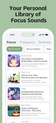 - Focus Sounds: Boost concentration with white noise, binaural beats, and ambient sounds.