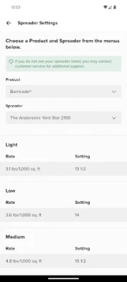 SPREADER SETTINGS No more guess work. Simply select your spreader model to easily access the rates and settings for all your products. Achieve optimal coverage and effectiveness with this user-friendly tool.