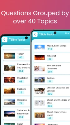 Here is a list of all categories that the app includes: Parables,Past and Present Prophesies,Future Prophecies,Prayer,Occult, Magic, Spiritism,Miscellaneous Bible Questions,Mosaic Law, Tabernacle, Tithes,Marriage,Miracles,Life Decisions and Doing the will of God,Kingdom and the Millennium,Judgment,Jesus’ Life, Teachings, and Death,Israel, Middle East,The Holy Spirit,God, Faith,Heaven and Earth,Hell, Death/Grave,Creation, Evolution,Chronology,Church history, False church,Church and The Bride of Christ,Christian Character and Conduct,Baptism,Bible and Bible Characters,Antichrist,Angels, Spirit Beings,Trinity,Resurrection, Eternal life, Immortality,Revelation,Sabbath,Religions,Salvation, Ransom and Restitution,Satan,Jesus’ Second Advent, Rapture,Soul