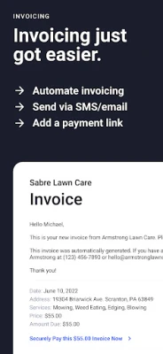 - Check automatically sends invoices with a link to pay online via text or email so your lawn care clients can pay you FASTER.