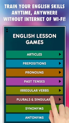 Master English grammar and vocabulary with 10 engaging games covering Articles, Prepositions, Pronouns, Past Tenses, Irregular Verbs, Plurals, Singulars, Synonyms, Antonyms, Conditionals, and Phrasal Verbs.