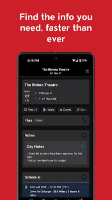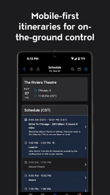 The app is designed to provide quick access to the critical information for each day. Data is stored locally for later offline access so you can avoid costly international roaming data fees. The color scheme is all black - the official color of touring bands and road cases. It can be none more black!