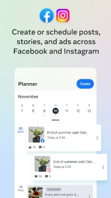 • Create, schedule, and manage posts and stories across your Facebook Page and Instagram account