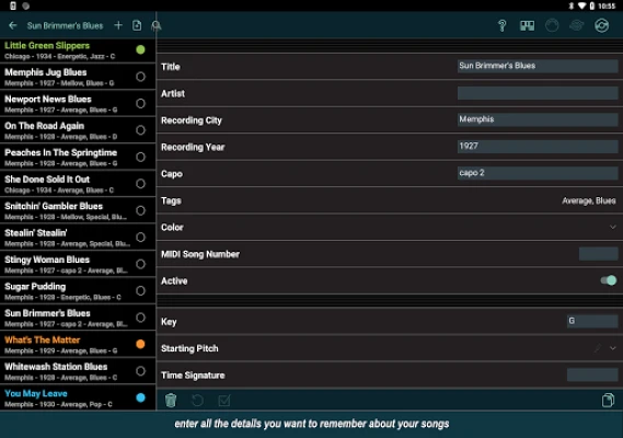 Set List Maker can store your lyrics and chord charts, but it can also keep track of your rehearsal notes and serves as an archive of all your set lists. You can include multiple documents and reference recordings for each song. Then design your own screen layouts to show the most important information in each setting you play in.